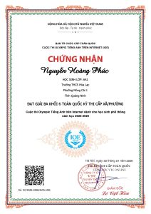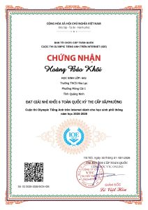 Chúc mừng Em Hoàng Bảo Khôi (6A2) đạt giải Nhì cấp toàn quốc, giải Nhất toàn Tỉnh; Em Nguyễn Hoàng Phúc (6A1) và Nguyễn Ngọc Diệp (6A1) đạt giải Ba cấp toàn quốc, giải Nhất toàn Tỉnh; Em Nguyễn Đức An (8C1) đạt giải khuyến khích toàn quốc, giải Nhất toàn Tỉnh; Các em Nguyễn Chí Hưng (6A2), Nguyễn Tuấn Minh (7B1) và Tống Bảo Ngân (7B1) đạt giải Khuyến khích toàn quốc và giải Nhì toàn Tỉnh.