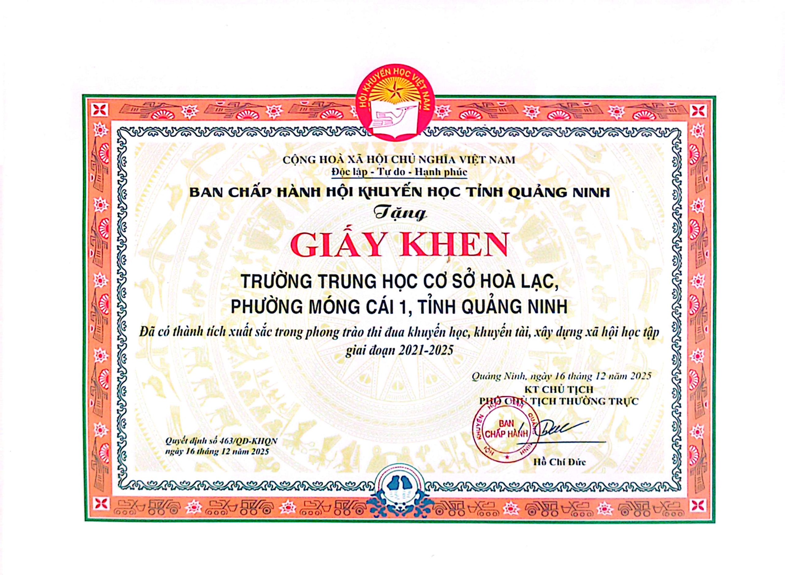 ❤🔶Trường THCS Hòa Lạc vinh dự là 1 trong 9 tập thể được Ban Chấp hành Hội Khuyến học tỉnh Quảng Ninh tặng Giấy khen do đã có thành tích xuất sắc trong phong trào thi đua khuyến học, khuyến tài, xây dựng xã hội học tập giai đoạn 2021 – 2025.